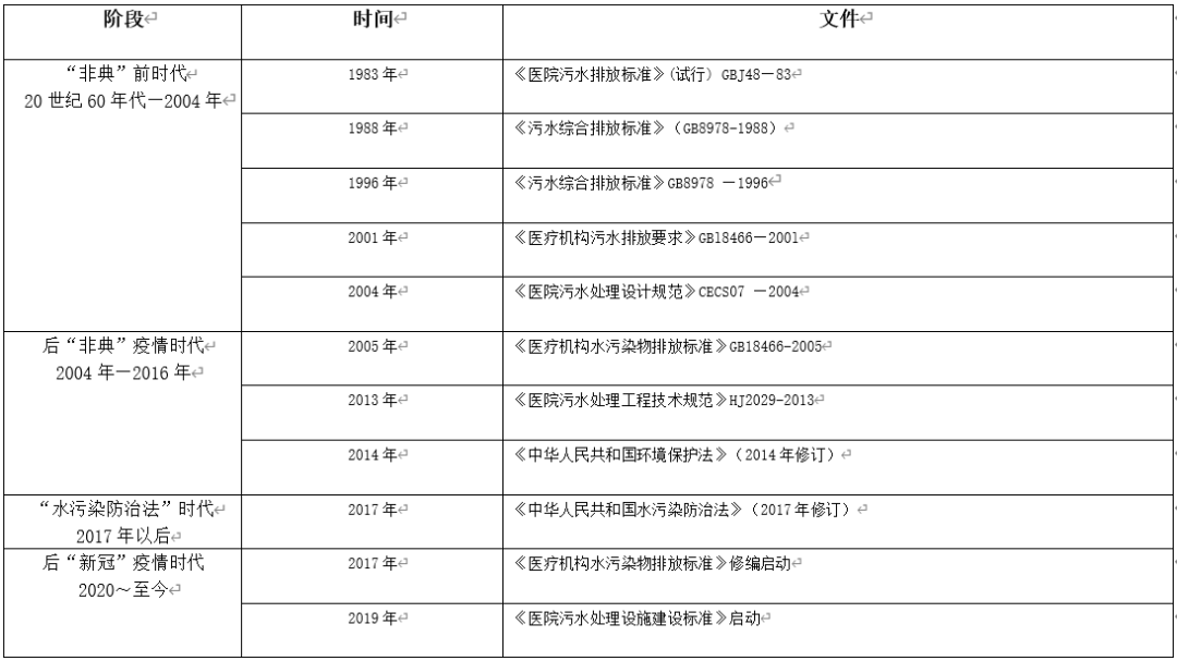 我国对于医疗废水的整体全面管控,始于二十年前的SARS疫情。此前,执行排放标准为《污水综合排放标准》(GB 8978-1996)中有关医疗机构水污染物排放标准部分内容,当时,医院污水处理率不高,仅有少数大型医院具有污水处理设施。SARS过后,我国迅速推进了相关法规标准的制定,相继发布《医疗机构水污染物排放标准》《医院污水处理工程技术规范》《医院废水处理技术指南》等。