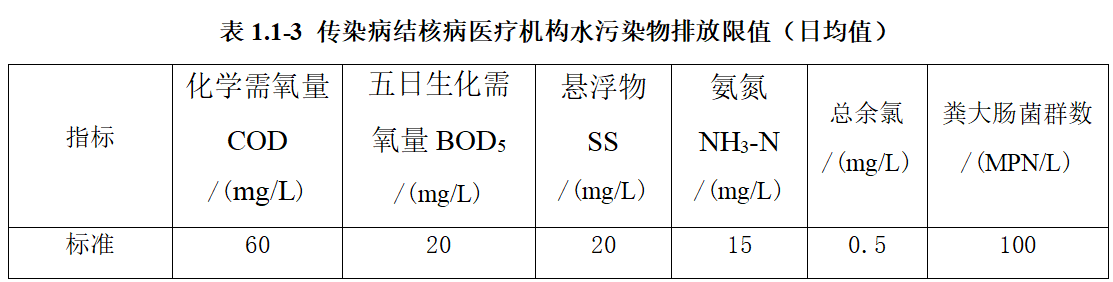 带传染病房的综合医疗机构,应将传染病房污水与非传染病房污水分开。传染病房的污水、粪便经过消毒后方可与其他污水合并处理。传染病医疗机构污水排放执行表1.1-3的规定。