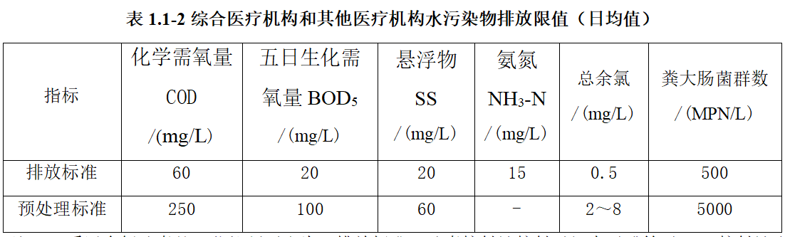 县级及县级以上或20张床位及以上的综合医疗机构和其他医疗机构污水执行国家标准《医疗机构水污染物排放标准》GB 18466-2005中表2综合医疗机构和其他医疗机构水污染物排放限值(日均值)的规定,直接或间接排入地表水体和海域的污水执行表1.1-2 “排放标准”限值的规定;排水至终端已建有正常运行城镇二级污水处理厂的下水道污水,执行表1.1-2“预处理标准”限值的规定。
