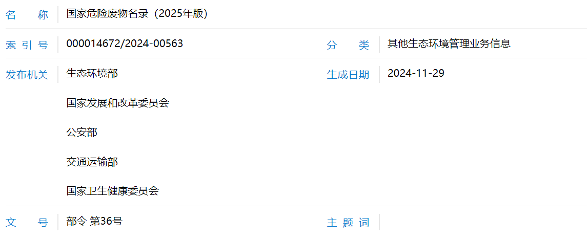 第八条:本名录自2025年1月1日起施行。《国家危险废物名录(2021年版)》(生态环境部、国家发展和改革委员会、公安部、交通运输部、国家卫生健康委员会令第15号)同时废止。
