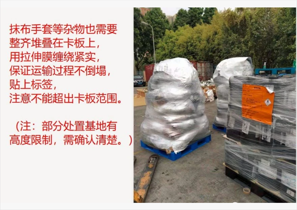 2.必须用卡板和拉伸膜打包成一板一板,收运时可直接叉走;